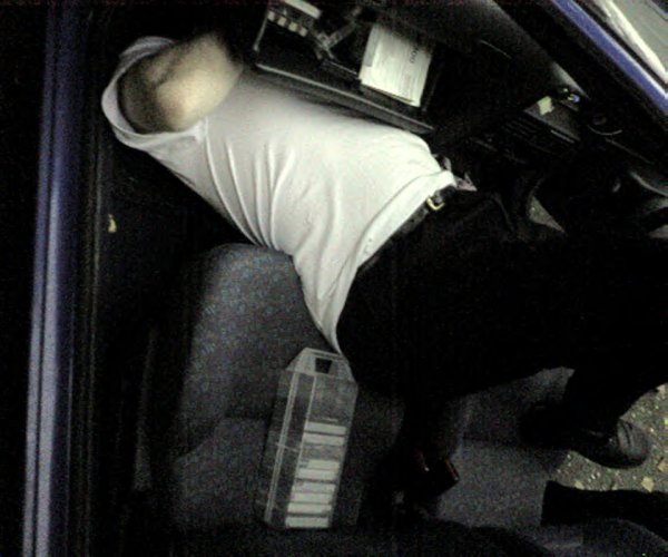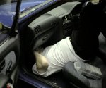 Onlookers were surprised to see Cheesy randomly place his head in the footwell of Roo's car. |